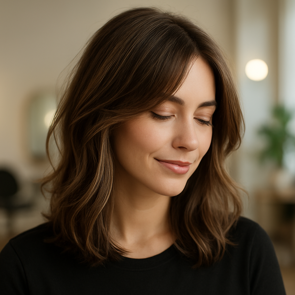 Glattes Haar zeigt Stufen besonders klar: Saubere, weiche Abstufungen lassen Licht spielen und schaffen Dimension. Gerade bei sehr glattem Haar können dezente Highlights entlang der Stufen zusätzliche Tiefe erzeugen, ohne aufdringlich zu wirken.